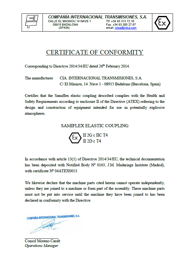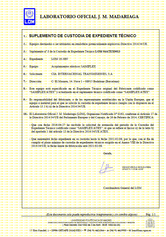 De acuerdo con la directiva ATEX 2014/34/EU, los acoplamientos para ejes, están clasificados como unidades que forman parte de un equipo, dentro del grupo de materiales no eléctricos. El acoplamiento elástico Samiflex®, reune los requisitos de conformidad ATEX para el grupo II, categorías 2G (gases) y 2D (polvo), grupo de explosión IIC y temperatura T4. Las instrucciones de montaje del acoplamiento Samiflex® con cualificación ATEX están disponibles para nuestros clientes bajo petición.