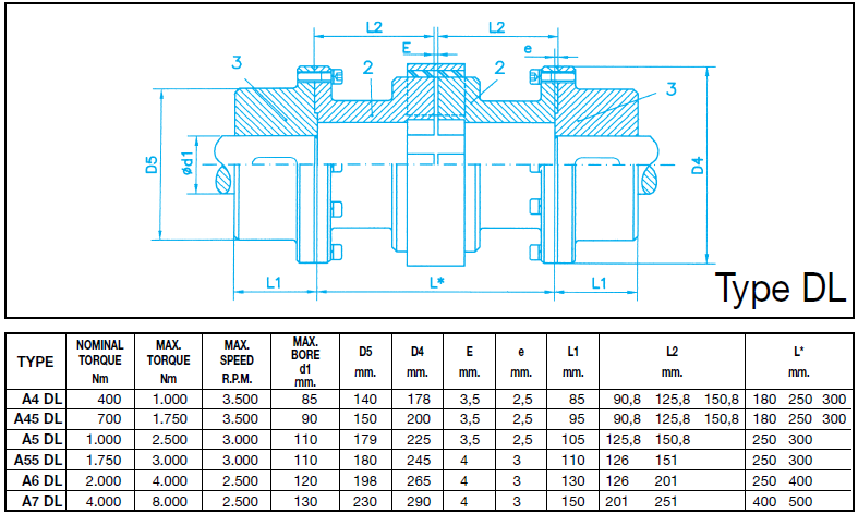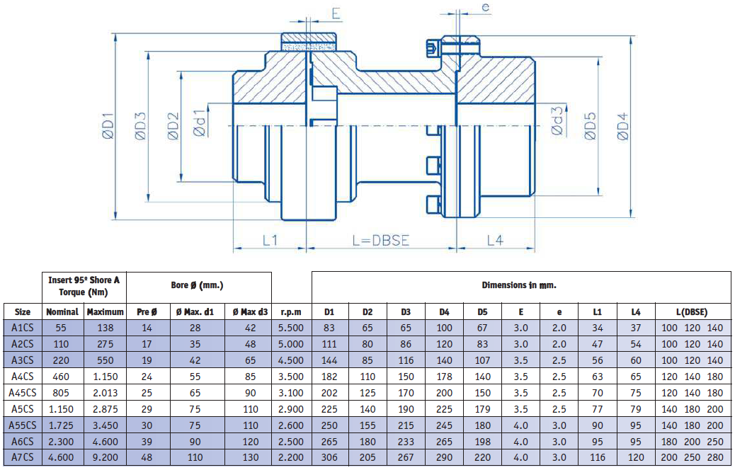 It can be configured with a standard A or CS hub, a spacer, a flange hub, a ring, and an elastic insert. The spacer allows a free distance between shafts, enabling the pump rotor to be removed for maintenance without the need to move any components of the assembly.
