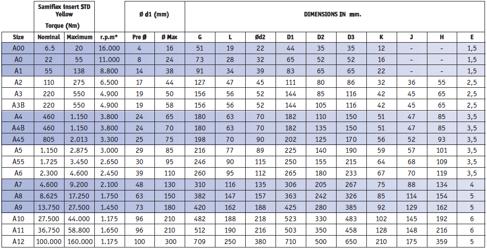 The standard Samiflex® Type A coupling consists of four components: two identical hubs, one elastic insert, and one clamping ring.